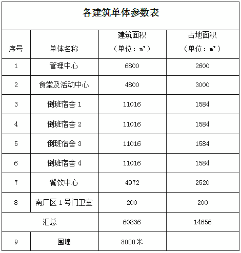 采購項(xiàng)目內(nèi)容包括:管理中心、食堂及活動(dòng)中心、倒班宿舍(暫定四棟)、餐飲中心、南廠區(qū)門衛(wèi)室、圍墻立面概念設(shè)計(jì),各單體參數(shù)如下表: