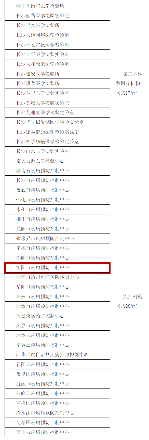 經(jīng)國家衛(wèi)生健康委臨床檢驗(yàn)中心《新冠病毒核酸檢測信息平臺(tái)》查詢,湖南開展新冠病毒核酸檢測的醫(yī)療機(jī)構(gòu)名單5月19日下午公布。其中,衡陽有9家醫(yī)療單位可開展新冠病毒核酸檢測,他們分別是南華大學(xué)附屬第一醫(yī)院、南華大學(xué)附屬第二醫(yī)院、南華大學(xué)附屬南華醫(yī)院、衡陽市中心醫(yī)院、衡陽市第一人民醫(yī)院、衡陽市第三人民醫(yī)院、衡東縣人民醫(yī)院、常寧市人民醫(yī)院、衡陽市疾病預(yù)防控制中心。具體名單如下: