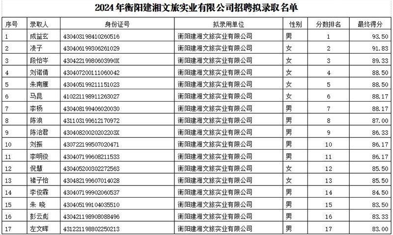 2024衡陽(yáng)建湘文旅實(shí)業(yè)有限公司面向社會(huì)公開(kāi)招聘擬錄取人員名單公示